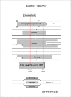 Together with the renovation and rebuilding work as part of the Saarbrücken 21 (Eurobahnhof) project, the pedestrian tunnel, which previously ended at platform  16, and to about 2001 at platform 22, was extended into the district of Rodenhof. There a new entrance was built, the North Terminal, which connects to a new Park & Ride area with several hundred spaces; a direct connexion to the Ludwigsbergkreisel and from there to the A 1, A 620 and A 623 motorways is planned. If required the DB-Servicepoint may be opened again.