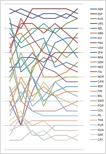 Graph showing the daily standings in the 470 during the 1976 Summer Olympics