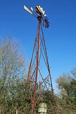 A former windmill is south of the town, along the country road No. 2 (road from Saint-Georges-du-Bois at the junction of cinq routes) (47°58′07.92″N 0°06′13.26″E / 47.9688667°N 0.1036833°E / 47.9688667; 0.1036833). At a height of about 10 metres (33 ft), it is made of rusty iron. It is equipped with a hydraulic pump used to raise water from the water table nearby. The origin of this windmill is not yet determined, but the pump was manufactured by Dragor in Le Mans,[45] which reduces the manufacture time to between 1923 and 1959. As for the windmill, it seems (the painton the blades being very damaged) to be branded Le Mistral.