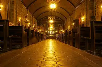 The large wall paintings on wood panels inside the church were executed by another notable son of Paete, Luciano Dans. These depict Langit, Lupa, Impiyerno – Heaven, Earth, Hell – and large murals of Saint Christopher. Dans used natural color pigments mixed with volcanic ash and brushes made from cats' hair to create the murals.[10] The large painting of San Cristobal on wood was purchased during the time of Father Francisco de Santa Gonzaleza for ₱22 in October 1852.[6] Unfortunately, the two St. Christopher paintings currently need immediate conservation; a lot of wood panels inside the church, including the painted wood panels, are infested by termites.[11][12]