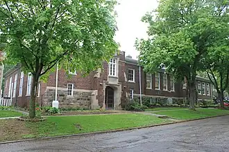The first St. Mary's School, located across the street from the rectory, was constructed in 1906 for first through eighth grade students.[2][3] It was a two-story brick structure, with classrooms on the first floor and an assembly hall on the second.[3] That building burned in 1925,[4] likely due to a faulty furnace.[3] The parish immediately began plans for a new school, hiring Detroit architect Arthur DesRosiers to design it and George Talbot as the contractor.[3] The building was completed by November 1925.