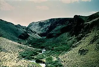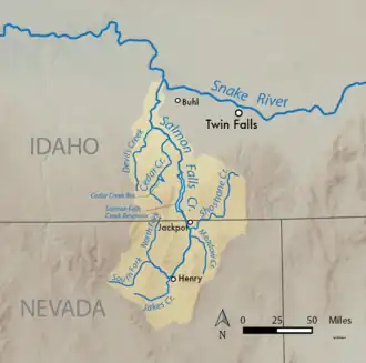 Salmon Falls Creek is a tributary of the Snake River, flowing from northern Nevada into Idaho in the United States. Formed in high mountains at the northern edge of the Great Basin, Salmon Falls Creek flows northwards 121 miles (195 km),[3] draining an arid and mountainous basin of 2,103 square miles (5,450 km2). The Salmon Falls Creek valley served as a trade route between the Native American groups of the Snake River Plain and Great Basin. Today, most of its water is used for irrigation.