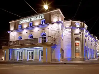 The Salzburg State Theatre (Salzburger Landestheater) is a theatre situated in Salzburg, Austria, a venue for opera, theatre, and dance, contemporary and older works, with resident companies of actors, singers and dancers. The theatre presents approximately 400 performances each season, from September to June. The main theatre building is located next to the Mirabell Gardens and seats an audience of 707. The staff consists of 340 people originating from 35 countries.