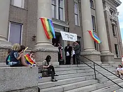Emma Foulkes and Petrina Bloodworth were the first same-sex couple to marry in Georgia just one hour after the Supreme Court's ruling. Fulton County Judge Jane Morrison officiated at their marriage at the Fulton County Courthouse in Atlanta. The Mayor of Atlanta, Kasim Reed, said, "Today is a historic occasion for the City of Atlanta, for Georgia and for America. The Supreme Court's ruling marks a momentous victory for freedom, equality, and love. It is clear that the arc of history continues to bend ever closer toward justice."[17] Jeff Graham, the executive director of Georgia Equality, issued the following statement: "The United States Supreme Court has ruled in favor of the freedom to marry across the nation. It's a national victory – and it means that soon, thousands of loving, committed couples throughout the United States – including our state of Georgia – will be able to say 'I do' and at last be respected under the law."[18] Christie and Kindra Baer, a couple for 13 years, were the first to receive a marriage license in Savannah,[19] and Moriah Martin and Jordyn Dolente were the first to marry in Athens just after 2 p.m. at the Clarke County Courthouse.[20] Taylor Nash and Kelly Martinelli were the first same-sex couple to marry in Gwinnett County. Representative John Lewis welcomed the court ruling, saying, "Races don't fall in love, genders don't fall in love--people fall in love", and Representative Hank Johnson called it "historic". Bernice King, CEO of The King Center and daughter of Martin Luther King Jr., said, "It is my sincere prayer that this ruling helps to alleviate violence, in all forms, including physical force, toward our LGBT brothers and sisters; and that the Supreme Court ruling encourages the global community to respect and embrace all LGBT global citizens with dignity and love. In the words of our founder and my mother, Coretta Scott King, 'The Civil Rights Movement that I believe in thrives on unity and inclusion, not division and exclusion.'"[20] State Senator Vincent Fort said the decision was "a victory not just for the LGBT community but for all Americans who believe in justice", and Rob Wright, the Episcopal Bishop of Atlanta, said, "In the days ahead, whatever your position, I ask you to keep close to your heart and lips the words of scripture, that "God is love." Christ's church is trans-political, above all earthly partisanship. Therefore, if love has won even a small victory today, then let us rejoice."[20]