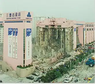 On June 29, 1995, the Sampoong Department Store (삼풍백화점; Hanja: 三豐百貨店) in Seocho District, Seoul, South Korea collapsed due to a structural failure. The collapse killed 502 people and injured 937, making it the largest peacetime disaster in South Korean history. It was the deadliest non-deliberate modern building collapse until the 2013 Rana Plaza factory collapse in Bangladesh.[1][2]
