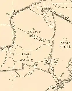 1953 cadastral map showing "Roger Creek" and its three tributaries: the South, Middle, and North branches
