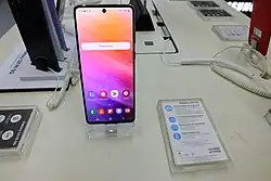 It has a 6.7-inch diagonal touchscreen, Super AMOLED+ Infinity-O, rounded corners and FHD+ resolution of 1080 × 2400 pixels. The screen supports a 120 Hz refresh rate. For screen protection it uses Gorilla Glass 5.[8]
