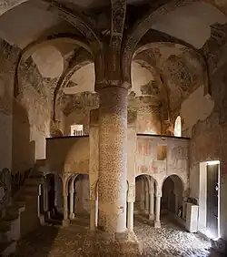 The hermitage housed many fine Romanesque frescoes from about 1125; most of these have been removed, but some have remained. Two sections, transferred to canvas, are now in the Indianapolis Museum of Art, showing the Entry of Christ into Jerusalem and the Wedding at Cana.[7] Other sections, including The Healing of the Blind Man and the Raising of Lazarus and The Temptation of Christ are in the Metropolitan Museum of Art in New York,[8] and in the Prado. The paintings are considered the work of three anonymous local artists. All decorative motifs on arches and vaults, as well as the large biblical scenes and the paintings on the apse, are attributed to the Master of Maderuelos, or First Master of Casillas. The hunting scenes of the lower areas, which are the most original, are attributed to the Master of San Baudelio. A third master of more modest proficiency is considered the author of the paintings inside the choir. [The paintings were done by the Catalan Master of Tahull (Taüll in Catalan), whose best known works are in Sant Climent de Taüll and the Museu Nacional d'Art de Catalunya in Barcelona,[9] with two other painters.]? The scenes of the Life of Christ are unusual in Spanish painting at this period; these are in American museums, while smaller elements including scenes of hunting and falconry and decorative copies of textiles are in Madrid as well as New York.[10] The frescoes include that of a camel and of a war elephant, which were inspired by Muslim motifs.[1]