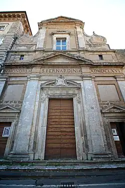 The church of San Bernardino was built in 1657 to a design by Cosimo Poli, nephew of Bishop Cardinal Fausto Poli. Located between the Palazzo del Conte Lodovico di Marsciano (now called Palazzo Crispo Marsciano and the monastery. The church layout is elliptical and has four side altars. The cloistered nuns choir was located at the rear of the church. The main altarpiece depicts an Enthroned Madonna and child between Saints Peter and Paul with Saints Francis and Bernardino, attributed to Sinibaldo Ibi. Near the entrance, the travertine holy water stoup is attributed to Ippolito Scalza. The first altar on the right depicts the Education of the Virgin (circa 1650) and is attributed to Giacinto Gimignani. In the presbytery are two panels depicting the Blessed Angelina of Montegiove (also known as Angeline of Marsciano), and part of the family of the Counts of Marsciano, and including Bishop Giuseppe dei Conti di Marsciano, who consecrated San Bernardino in 1739.