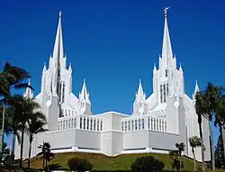 Located near the La Jolla community of San Diego, it was built with two main spires, with four smaller spires at the base of each main spire. The East spire has an angel Moroni statue.[3] This temple was designed by architects William S. Lewis Jr., Dennis Hyndman, and Shelly Hyndman, with an exterior made with marble chips in plaster.[3][4][5] A groundbreaking ceremony, signifying the beginning of construction, was held on February 27, 1988, with church president Ezra Taft Benson presiding.[3]