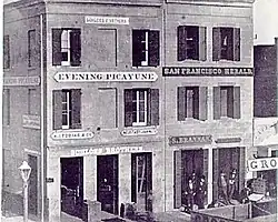 In May 1856 James P. Casey of the city board of supervisors shot and killed James King of William, editor of the opposition newspaper The Evening Bulletin, for publishing an editorial that exposed Casey's criminal record in New York.[28] This led to creation of the second San Francisco Committee of Vigilance.[3] This was an extra-legal organization supported by businesses to take the law into their own hands.[29] Nugent, a Democrat, opposed the vigilantes. The mainly Republican vigilantes were furious and nearly destroyed the newspaper by cancelling advertisements and subscriptions.[30][c] Copies of the Herald were burned in public. The Herald lost the auctioneer ads, and was at once reduced to a quarter of its former size. The Chronicle, which also opposed the committee, suffered equally. The Alta California received most of the business taken from the Herald and Chronicle, and became the leading morning paper.[8]