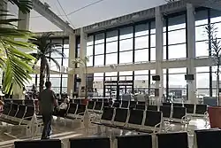Terminal 1, covering an area of 16,580 square metres (178,500 sq ft), houses arrival and departure facilities for domestic flights within a single-story building. It features a distinctive roof over the departures concourse with peaked white structures. The arrivals area includes a baggage claim, car rental services, taxi stands, snack bars, and souvenir shops. The departures section includes a check-in area, a security checkpoint, and a concourse with a food court and eight gates on the ground level, allowing passengers to walk to their aircraft. A mezzanine level, housing a VIP lounge, is accessible from the departure concourse.[8]