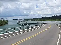 The San Juanico Bridge[6] (Filipino: Tulay ng San Juanico; Waray: Tulay han San Juanico) is part of the Pan-Philippine Highway and stretches from Samar to Leyte across the San Juanico Strait in the Philippines. It is located by the Municipality of Santa Rita, Samar, and the City of Tacloban.[2] Its longest length is a steel girder viaduct built on reinforced concrete piers, and its main span is of an arch-shaped truss design. Constructed during the administration of President Ferdinand Marcos through Japanese Official Development Assistance loans,[7] it has a total length of 2.16 kilometers (1.34 mi)—the third longest bridge spanning a body of seawater in the Philippines after the Cebu–Cordova Link Expressway and Panguil Bay Bridge. It was also the longest bridge in the Philippines upon its opening in 1973, surpassed in 1976 by Candaba Viaduct of North Luzon Expressway (NLEX), another bridge that connects from one province to another, connecting the provinces of Pampanga and Bulacan.[8][9]