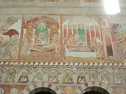 On the walls of the nave is a large fresco cycle, recently restored, by the Lucchese Deodato Orlandi (early 14th century), which was commissioned by the Caetani family for the 1300 jubilee. In the lower part are Portraits of Popes, from St. Peter to John XVIII (1303); the intermediate portion has thirty panels with Histories of St. Peter's Life (as well of those of St. Paul, Constantine and St. Sylvester), similar to those in the Old St. Peter's Basilica and to Cimabue's work at San Francesco in Assisi. In the upper area are portrayed the Walls of the Heaven City, largely restored in the following centuries.[2]