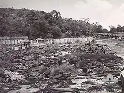 The prosperity of Sandakan as the capital of North Borneo was however ended when the Japanese occupied the town on 19 January 1942.[4][27] During their occupation, the Japanese restored the town's previous name, Elopura and established a prisoner of war camp to hold their captive enemies. Allied planes started to raid Sandakan in September 1944. As the Japanese feared further retaliation from the Allied forces, they began to move all prisoners and forced them to march to Ranau.[28] Thousands of British and Australian soldiers lost their lives during this forced march in addition to Javanese labourers from the Dutch East Indies.[29][30][31] Only six Australian soldiers survived from this camp, all after escaping. Sandakan was completely destroyed both by bombing from Allied forces and by the Japanese occupation.[6][32][33]