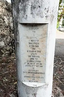 The Sandakan War Monument (Malay: Tugu Peringatan Perang Sandakan) is a monument established by the British located in the town of Sandakan, Malaysia, to commemorates the town citizens who died during the Second World War. The monument is part of the Sandakan Heritage Trails, a "Heritage Trail" which connects every historic sights of Sandakan.