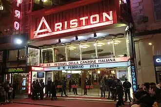 In 1977, the Sanremo Casino, which hosted all the previous editions of the contest, was closed for renovations, therefore the show moved to the Teatro Ariston.[40] The theater later became the usual location for the annual contest,[41] hosting it every year except in 1990, when the show was held at the Nuovo Mercato dei Fiori, also known as Palafiori.[42]