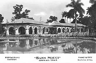 The Sans Souci was a nightclub within a natural environment and located seven miles outside of Havana. It had a restaurant and floor shows nightly that attracted a great number of tourists. Its greatest profits came from an amusement arcade operating in a small room next door to the Sans Souci that was not advertised since there was no official license for its exploitation.[1]