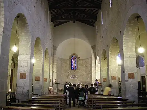 The name of the neighborhood Giogoli appears to be derived from gioghi or yokes, and may refer to the low hills of the region. A church at the site is mentioned by 10th-century; and a plaque in the adjacent cloister quoted a papal bull from 1187, wherein Pope Gregory VIII defined certain privileges granted to the church. The church was initially patronized by the Buondelmonti family. The Romanesque stone layout with a semi-circular apse underwent many reconstructions over the centuries, but is still maintained from the exterior. The facade has a small narrow mullioned window. Around 1712, the interior acquired a heavy Rococo decoration with stucco.[1] Since the 19th century, much of the nave decoration has been stripped. During World War II, bombing caused the nave roof to collapse. Of the paintings from the 18th century, the counterfacade still has a depiction of the Samaritan at the Well and the Baptism of Christ by Pietro Pertichi; in the right transept is an Annunciation, a St Joseph and a St Francis of Assisi by Francesco Manetti.