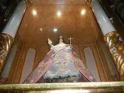 | Attributes | A palm branch in the right hand, cross on left, crocodile under her feet, diadem, sash |