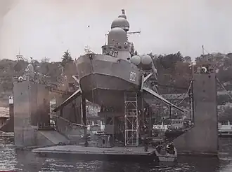The MRK-5 (МРК-5) was laid down at the Petrovski plant in Leningrad in 1973 and was on trials until 1977. In 1979, she was transferred to the Black Sea Fleet via Russian inland waterways. She was based in Sevastopol until 1990, when she was decommissioned. In 1992, she was damaged by fire and sunk in shallow water. The wreck was raised and scrapped.