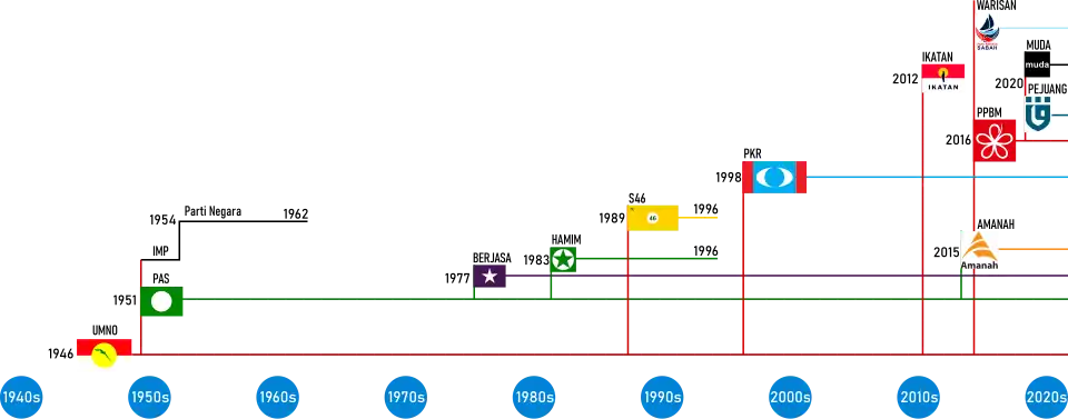 S46 | 1989–1996 | Formed by the losing faction in UMNO's contentious party elections in 1987, it was led by Tengku Razaleigh Hamzah. It was part of the Gagasan Rakyat and Angkatan Perpaduan Ummah coalitions that contested the 1990 general election. By the mid 1990s it had grown severely weakened and in 1996 the party was dissolved when Razaleigh returned to UMNO. |
