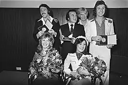 Brotherhood of Man, Hiller, and Ainsworth just after winning, with the songwriters holding their medals.