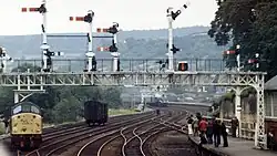 From 1907 until 2010, the station approaches were controlled from a 120-lever signal box named Falsgrave; this is sited at the outer end of platform 1 and close to the former excursion station at Scarborough Londesborough Road. In its final years, Falsgrave box controlled a mixture of colour-light and semaphore signals, including a gantry carrying 11 semaphores. The signal box was decommissioned in September 2010 and the gantry was dismantled and removed in October 2010. Its new home is at Grosmont railway station, on the North Yorkshire Moors Railway. The new signalling is a relay-based interlocking with two- and three-aspect LED signals controlled from an extension to the existing panel at nearby Seamer.[4][5] Simplification of the track layout and major renewals took place at the same time.