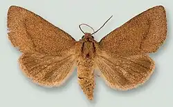 It is unique within the genus in having a simple forewing pattern that consists of only a slightly sinuate, dark-brown postmedial line and a solid-colored hindwing.