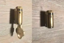 A demonstration of the checkpin for a Schlage Everest cylinder. When the key is inserted (left), the checkpin is retracted, allowing the lock to turn. When the key is not inserted (right), the checkpin is extended, preventing the lock from turning.