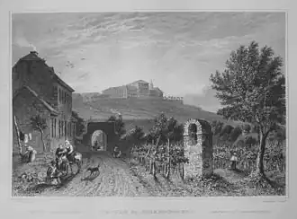 The estate changed hands several times during the Napoleonic Wars: after the expropriation caused by the secularization in 1802, it became property of prince William V of Orange, the last Stadtholder of the Dutch Republic, who gave it to his son, hereditary prince William, who later became the first king of the Netherlands.[8] But in 1806, he was expropriated as he refused to join the Confederation of the Rhine, and Napoleon granted the vineyard and palace to Marshal Kellermann, the first duke of Valmy.[8] In 1811, the estate was sold to the banker Peter Arnold Mumm from Frankfurt. At the Congress of Vienna in 1814, it was decided that Johannisberg became Austrian, although the Rheingau became part of the Duchy of Nassau.[9]