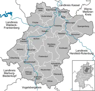 KasselFulda (district)Hersfeld-RotenburgKassel (district)Marburg-BiedenkopfWaldeck-FrankenbergVogelsbergkreisVogelsbergkreisWerra-Meißner-KreisKnüllwaldHomberg (Efze)FrielendorfSchwarzenbornNeukirchenOberaulaOttrauSchrecksbachWillingshausenSchwalmstadtGilserbergJesbergNeuentalBad ZwestenBorkenMorschenMalsfeldWabernFelsbergSpangenbergMelsungenKörleGuxhagenEdermündeGudensbergNiedensteinFritzlar