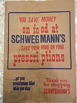 Schwegmann Brothers Giant Supermarkets shopping bag with an advertorial for discounted prescription drug prices