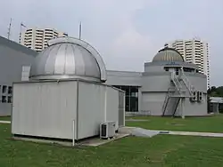 The main telescope of the Observatory is a 40-centimetre (16 in) Cassegrain reflector of a combined focal length of 520 centimetres (200 in).[8] The sub-telescope is a 15-centimetre (5.9 in) apochromatic Kepler refractor with a focal length of 180 centimetres (71 in). The equatorial mount for the telescopes was designed for Singapore's unique location; the accompanying English yoke provides the stability needed for the drive and tracking mechanisms. The 5.5-metre (18 ft) stainless steel dome can be made to swivel in any direction and its shutter can be made to slide open for the telescope to be focused on to interesting objects in the sky.
