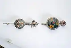 James Mosman was a son of John Mosman. He and James Cockie were made free men of the Edinburgh incorporation of goldsmiths on 1 May 1557.[44] He was the court jeweller for Mary of Guise, and reportedly produced pieces for both her and the royal family.[45] Mosman was executed for his loyalty to Mary, Queen of Scots, after the siege of Edinburgh Castle in 1573. He pledged Mary's jewels for loans and set up a mint for silver coins in the castle. He was hanged on 3 August 1573.[46]