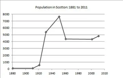According to census information, between 1881 and 1951, the population of Scotton increased from 116 to 7,655. In 1911 the population totalled 97 and by 1921 it was 558.[10] This major influx in population was most likely due to the opening of Catterick Garrison army barracks at the beginning of the First World War in 1914, when it was founded by Lord Baden Powell.[11] During the Second World War Catterick Garrison was home to over 40,000 military personnel and in 2012 it was still home to 13,000; so dependants of these service personnel living in Scotton would have led to this increase in population.[12] It had a population of 4,810 according to the 2011 census.[13] In 1951, the population of Scotton was 7,655, so it has decreased since due to the decline in military activity in neighbouring Catterick Garrison. Before the development of Catterick Garrison, Scotton was a country estate. Scotton Hall, its park, Scotton Lodge and Scotton Cottage are now surrounded by army barracks.[14]