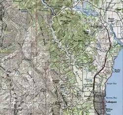 About 200,000 years ago the Clear Lake Volcanic Field blocked the lake's outlet.[11] The lake rose until it found a new outlet, draining west through the Blue Lakes into Cold Creek and the Russian River.[12] Clear Lake was almost 300 feet (91 m) higher than it is today, and Scotts Creek flowed into the lake from the west near where Lakeport is today. It formed a large delta there, which deposited the Lakeport ridge.[10]