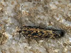 The wingspan is 12–14 mm (0.47–0.55 in).[3] Head rosy-whitish, crown sometimes greyish. Terminal joint of palpi shorter than second. Forewings ochreous, sometimes greyish-tinged or rosy suffused, suffusedly irrorated with blackish -grey on disc, four costal patches, and an apical patch; stigmata black, sometimes ringed with pale, first discal beyond plical; an ill-defined nearly straight pale fascia at 3/4; black terminal dots. Larva pale yellowish - green; each segment with a transverse series of irregular crimson blotches; dots blackish; head pale brown.[4][5][6][7]