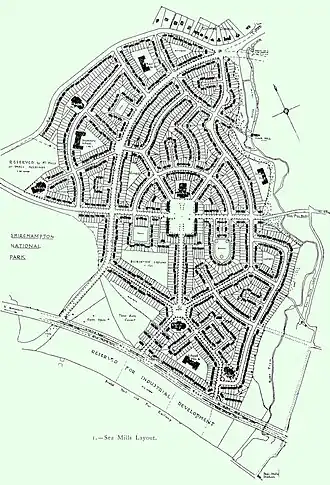 The Sea Mills area was entirely rural until the British government launched a heavily subsidised scheme after the First World War to build "homes fit for heroes".[15] The legislation did not receive royal assent until 31 July 1919. To ensure rapid implementation, however, that April Bristol Corporation had bought two farms on the southern edge of the King’s Weston Estate, on which to build a low-density garden suburb for the working classes to standards recommended in the Tudor Walters Report that the legislation was based upon.[16] The suburb takes its name from Sea Mills Farm, although the greater part was built over the former Clack Mill Farm, Shirehampton Road marks the boundary between them; the early 18th century Sea Mills farmhouse was to be preserved, but all buildings on Clack Mill Farm were demolished.[7]