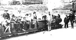 John J. Coit's locomotive at the Seaside Park in California. John Coit and his conductor "Shorty" Chase are shown just in front of the locomotive.