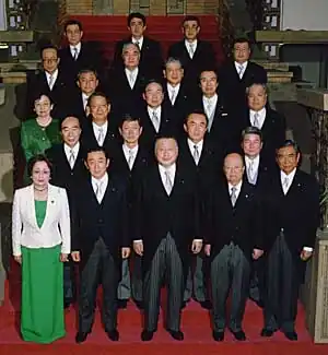 The Second Mori Cabinet governed Japan between July 2000 and April 2001 as a coalition government under the leadership of Prime Minister Yoshirō Mori of the Liberal Democratic Party. The cabinet was formed after the LDP-NKP-NCP coalition was returned to office with a substantially reduced majority in the June 25 general election, and inaugurated after Mori's re-election by the National Diet on July 4.[1] Unlike his first cabinet, which retained all of former Prime Minister Keizō Obuchi's ministers, Mori introduced several personnel changes, although this was done with reference to LDP factions.[2]