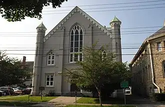 Second Tompkins County Courthouse, also known as Old Courthouse, is a historic courthouse located at 121 E. Court Street in Ithaca in Tompkins County, New York. It is the oldest building still standing in the county.[2] It is a two-story, 57 feet by 75 feet rectangular building with a three-story tower. The building is built of red brick, covered with stucco, over a stone foundation. The tower contains a belfry with a pointed arch opening on each of the four sides. It was built in 1854 and has a notable open timber roof.[3]