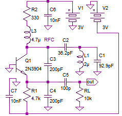 The schematic shows an example with component values.[2] The Seiler oscillator uses a LC circuit L1, C1 that is connected via C2 to a capacitive voltage divider C3, C4 that connects to the amplifier Q1. C1 and C2 are calculated for inductance L1 having a unloaded Q factor of 250. Resistor R1 sets the collector current to 0.5mA with no oscillation. The negative supply voltage V2 allows direct connection from Q1 base to ground. The radio frequency choke L3 is needed to isolate the LC circuit from the power supply, but has a potential problem. L3, C3 and C4 create a Colpitts oscillator circuit. R2 reduces the Q factor of L3 and prevents oscillation on the wrong frequency. The correct oscillator frequency is 10MHz. The load resistor RL is part of the simulation, not part of the circuit.