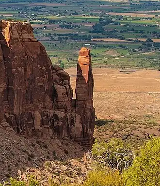 Sentinel Spire is a 5,500-foot-elevation (1,700-meter) sandstone pillar located in Colorado National Monument, in Mesa County of western Colorado, United States.[3] This 200-foot freestanding tower is situated in Wedding Canyon, one-half mile east of the monument's visitor center, and 9 miles (14 km) west of the community of Grand Junction.[5] It is also immediately south of Window Rock, and north of another climbing destination, Pipe Organ, both of which can be seen from viewpoints along Rim Rock Drive. The first ascent of the summit was made May 3, 1960, by Layton Kor, Harvey Carter, and John Auld via the class 5.10 route, Fast Draw.[6][7] This was the day before the climbers also made the first ascent of nearby Kissing Couple. The first solo ascent was made by Ron Olevsky in March 1976, and the first free ascent was made by Andy Petefish and John Christenson in 1978.[8] Some climbers refer to Sentinel Spire as Watusi Spear.[6]