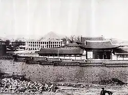Deoksugung, viewed from outside the palace walls, in 1911. Seokjojeon is visible to the left.