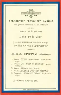 Music concert program held in honour of founding Matica Srpska in Dubrovnik, 1909