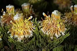 Serruria villosa, the golden spiderhead, is a flower-bearing shrub that belongs to the genus Serruria and forms part of the fynbos. The plant is native to the Western Cape, where it occurs only on the Cape Peninsula and just south of Constantia. The shrub is erect and grows only 50 cm tall and bears flowers from April to July.