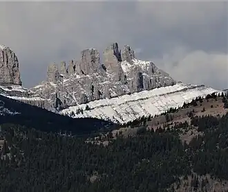 This landform was originally named "The Steeples" by the Palliser expedition.[4] The mountain's present toponym was officially adopted in 1978 by the Geographical Names Board of Canada.[2] The descriptive name is attributable to its seven distinct towers and pinnacles.[5]
