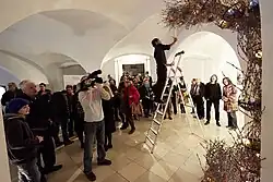 Fragile Hands, a curatorial essay on stated subjectivities. University of Applied Arts, Heilingenkreuzer Hof, Refektorium and Sala Terrena, Vienna, Austria. Featuring artists: Mohammed Al-Hawajri, Palestine/Masoumeh Bakhtiary, Iran/Binu Bhaskar, India/ Madhu und Hazra Chitrakar, India/ Rajib Chowdhury, India/ Ramesch Daha, Austria &Iran/ Natasha de Betak, France &India/ Majid Fathizadeh, Iran/ Debesh Goswami, India & France/ Probir Gupta, India/ Ghazaleh Hedayat, Iran/ Taha Heydary, Iran/ Khaled Jarrar, Palestine/ Rajkamal Kahlon, USA, India &Germany/ Katayoun Karami, Iran/ Leena Kejriwal, India/ Amir Mobed, Iran/ Masoumeh Mozafari, Iran/ Tarzan and Arab, Palestine/ Charley Nijensohn, Argentina & Germany/ Amin Nourani, Iran/ Lisl Ponger, Austria/ Simit Raveshia, India/ Oliver Ressler, Austria/ Atefeh Samaei, Iran/ Rozita Sharafjahan, Iran/ JJ Xi, China & UK/.[2][58][59]Fragile Hands opening 2014Fragile Hands
