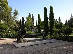 On Thursday 13 June 1974, four PFLP-GC[4][5] terrorists infiltrated the Lebanon-Israel border and invaded the kibbutz.[6] They entered one of the buildings shooting a pregnant woman Edna Mor (28) and another woman Shoshana Galili (58). Edna left behind a child and husband. The terrorists continued shooting at random. Judith Sinton (19),[7] a Kibbutz volunteer from New Zealand, on her way back to the apiary after breakfast, was shot and killed by one of the terrorists. The members of the kibbutz seized their weapons and ran in the direction from where gunfire was heard. In the gun battle that followed, all four terrorists were killed. The terrorists' aim was to take hostages to exchange for jailed terrorists. Their written message ends: "We love to die, as you love to live."[8] The artist Avraham Eilat who was at that time a member of the kibbutz documented the event.